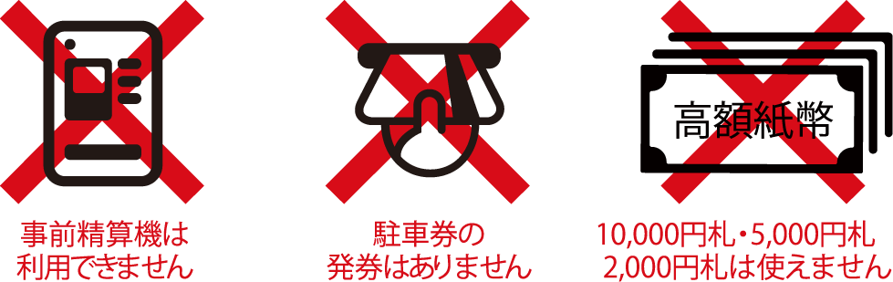 ・出庫時の精算で、10,000円札・5,000円札・2,000円札はご利用いただけません。