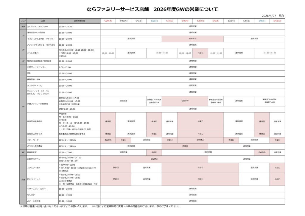 サービス店舗 GW期間の営業時間について いつもならファミリーをご利用いただきありがとうございます。 GW期間は、サービス店舗の営業時間が異なる場合がございます。 拡大版はこちら 詳しくは、ご利用の店舗へ直接お問合せください。 ※掲載内容は予告なく変更となる場合がございます。予めご了承ください。 ※状況により営業時間の変更・休業となる場合がございます。予めご了承ください。