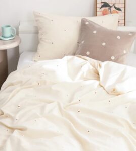 ベッドに合わせる寝具カバーにも新しいデザインが登場。デイジーモチーフの刺繍がちりばめられた、垢抜け感のある上品なデザインです🌼