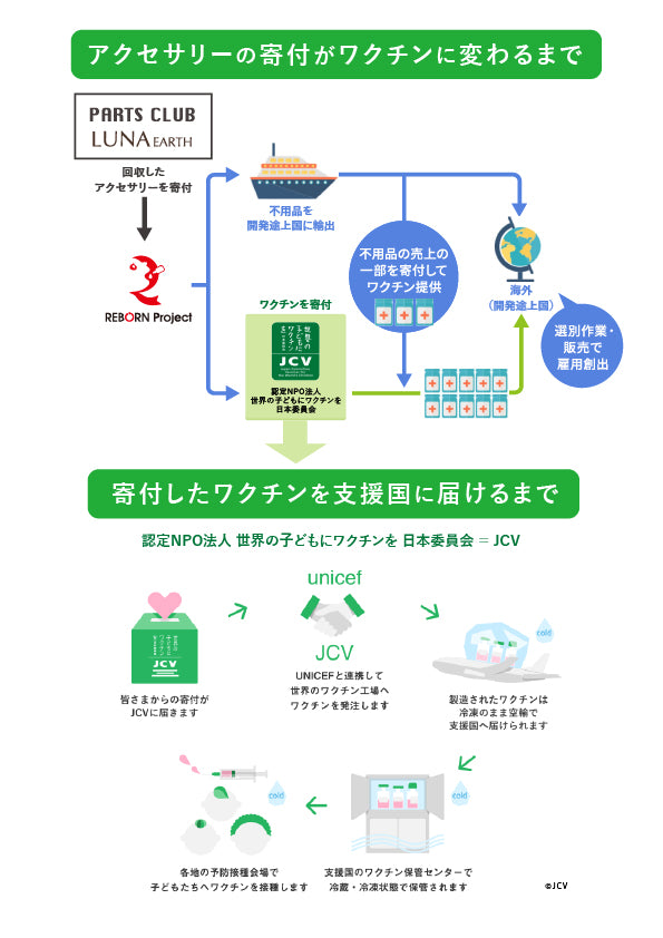 ご寄付いだきましたアクセサリーにつきましては、不用品を開発途上国に輸出し、海外で現地販売し売上の一部を寄付する「リボーンプロジェクト」を通じて、認定NPO法人世界の子どもにワクチンを日本委員会(JCV)にワクチンを寄付、ミャンマー、ラオス、ブータン、バヌアツの子どもたちにワクチンを届けます。