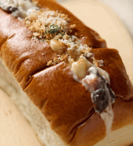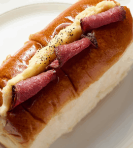 旨味たっぷりのローストビーフと、 なめらかなマッシュポテトに特選醤油の和風ソースを合わせた『#ローストビーフニコパン』