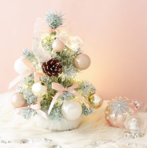 ファッションのトレンドでもあるリボンのオーナメントや、デザインの異なるオーナメント、ライトもついているので、小さいながらも存在感は抜群◎