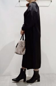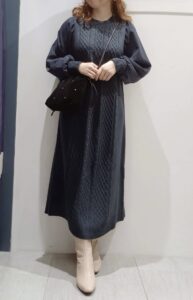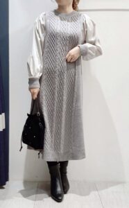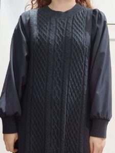 袖に布帛を切り替えた異素材のコンビのワンピース。立体感のあるケーブル編みが可愛く華やかです。袖はウィングスリーブデザインで軽やかな印象になります。