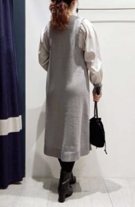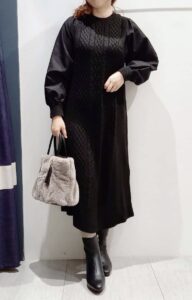 一枚で華やぐ、袖布帛ケーブルニットワンピース ¥6,597(税込)