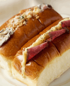 旨味たっぷりのローストビーフと、 なめらかなマッシュポテトに特選醤油の和風ソースを合わせた『ローストビーフニコパン』