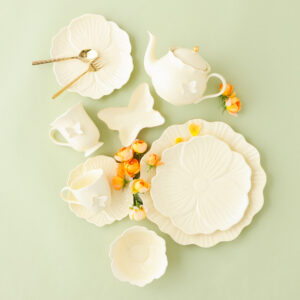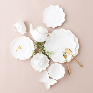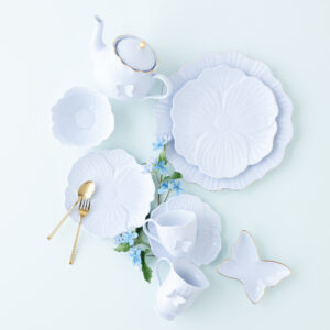 花びらの形をしたプレートや蝶のモチーフがついたカップ&ソーサー、ステム部分にガラスのお花がついたデザートグラスなど…💜