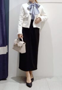 ①ボウタイ×ツイードの大人フェミニンスタイル