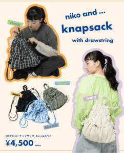 ファッション グッズ 3F niko and… nikoand… トレンドのナップサック5色展開で登場! 2026年3月30日(月) 更新 トレンドのナップサック5色展開で登場! 使い勝手の良いサイズ感で、A4ファイル・13インチPC・長財布、600mlボトル、ポーチなどの大きめな荷物収納可能前のドロストコードを引くと自分の好みにギャザーを寄せられ、荷物の量によって調節できるのもポイント。 646777 ORドロストナップサック \4,500(税込) 2026年3月30日(月) 更新