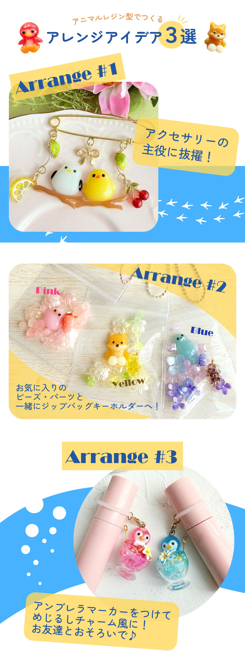 冬らしい表現はもちろん、透明感のあるカラーやポップな色づかいにすれば春夏のアクセサリーにもぴったりです。