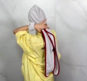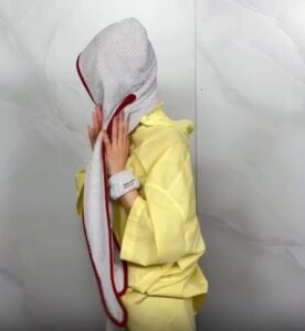 ①フードをすっぽり被り、タオルと髪を片側に寄せる