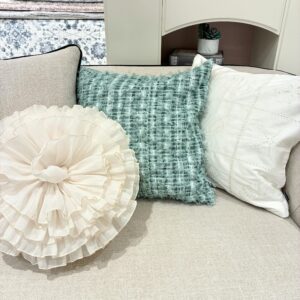 繊細なチュール生地を織り込んだ凹凸感のあるクッションカバーと、立体的なフリルのインテリアクッションで表情のあるコーディネートに仕上がります😊✨
