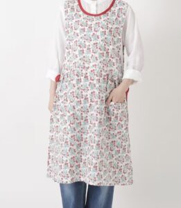 首元と腰ひもの生地がアクセントになっておりギフトにぴったりの華やかなエプロンです