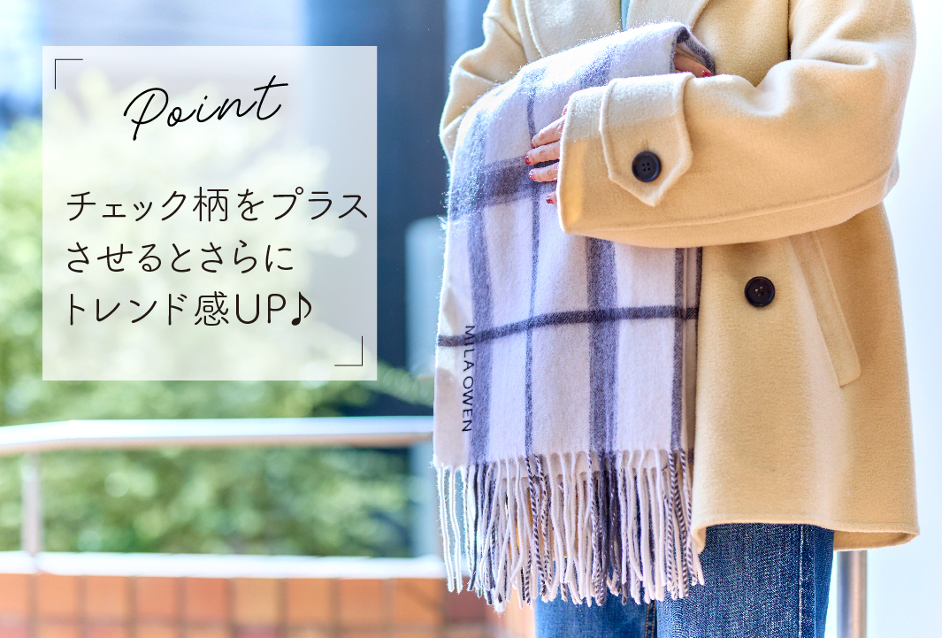 今シーズン再流行のチェック柄は、大判ストールで取り入れるのが「Mila Owen」流。白ベースのモノトーンがスタイリッシュで、合わせやすさも◎!素材はリッチなウール100%で、暖かさと肌触りの良さも両立できます。
