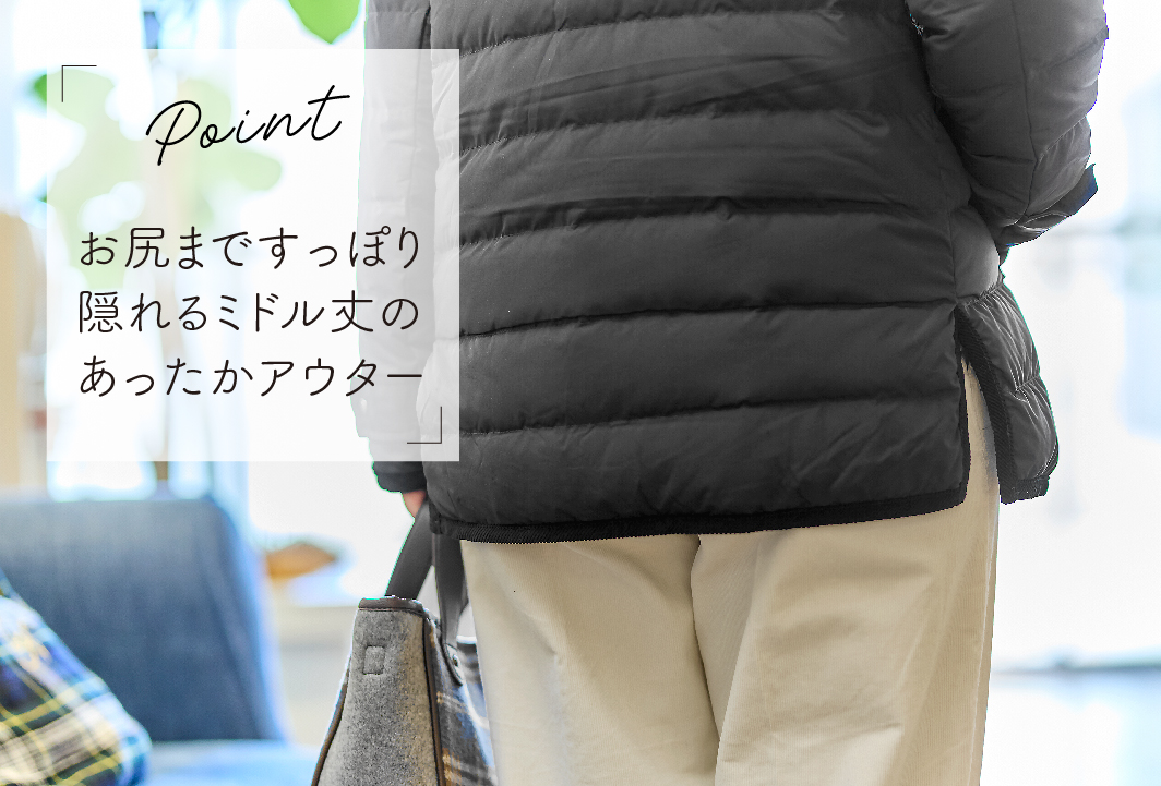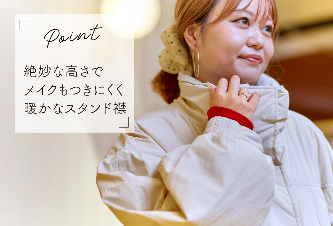 ソフトな風合いのダウンは適度な量でも暖かく、着膨れせずタテのシルエットに整えながら着用することができます。撥水加工で実用性も抜群!明るいパステルカラーのインナーをプラスし、メリハリを加えたコーデがおすすめです。