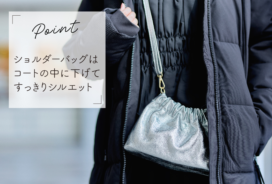 近年人気の巾着型を、華やかなシルバーカラーで楽しめるバッグ。シルバーは、きらめきをプラスする一方で、モノトーンカラーのため、合わせるアイテムを選びません。モードな雰囲気の中のハズしアイテムとしても活躍します。