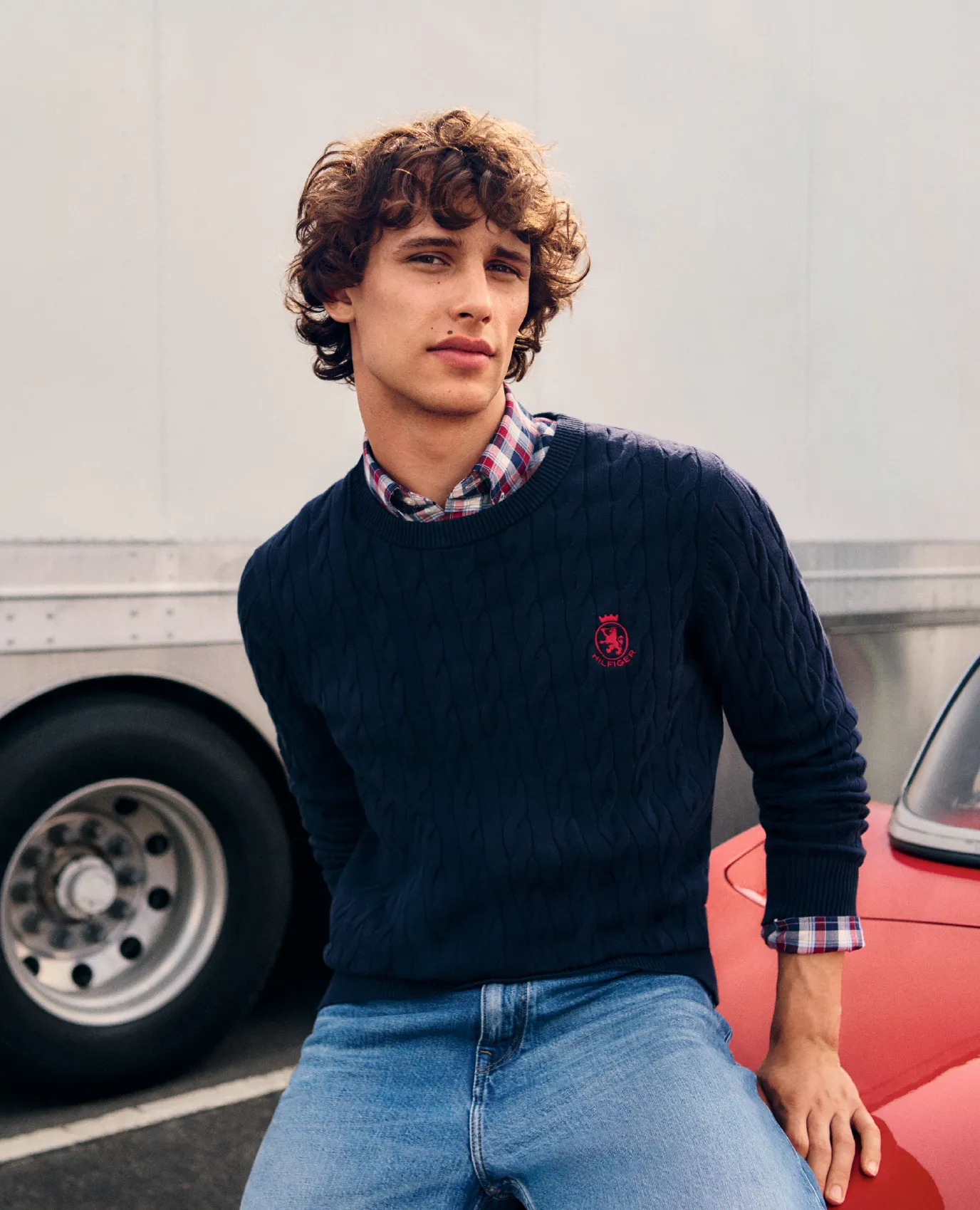 上品なケーブル編みが特徴のクルーネックセーター。ブランド40周年を記念した限定のクレストロゴがポイント。