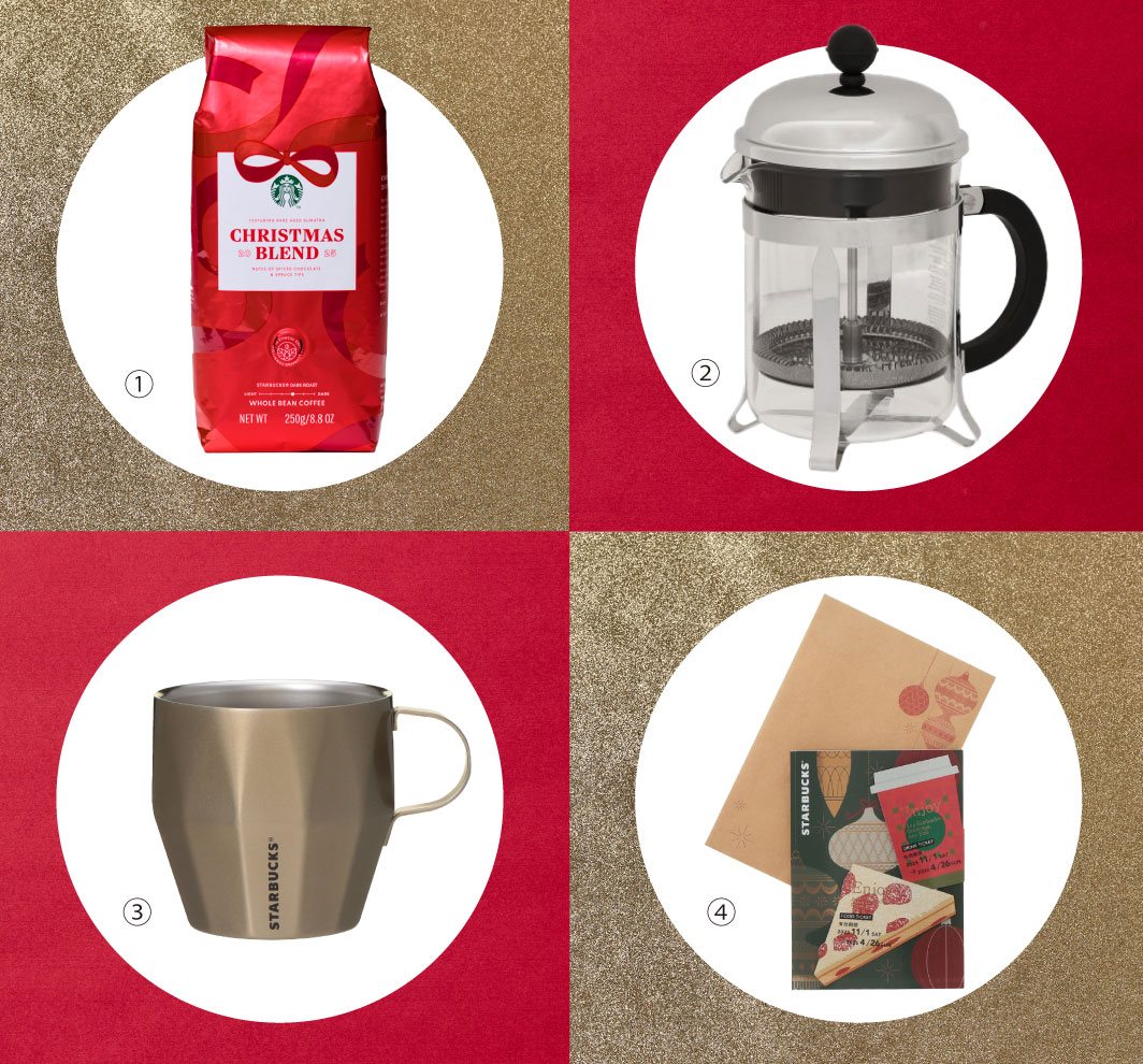 毎年クリスマスシーズンに人気のコーヒー豆をはじめ、コーヒープレスやマグカップ、店舗で使えるチケット付きクリスマスカードの4点セットでのプレゼントもおすすめ。これさえあれば、店舗だけでなくお家でもスターバックスの味を楽しめます。