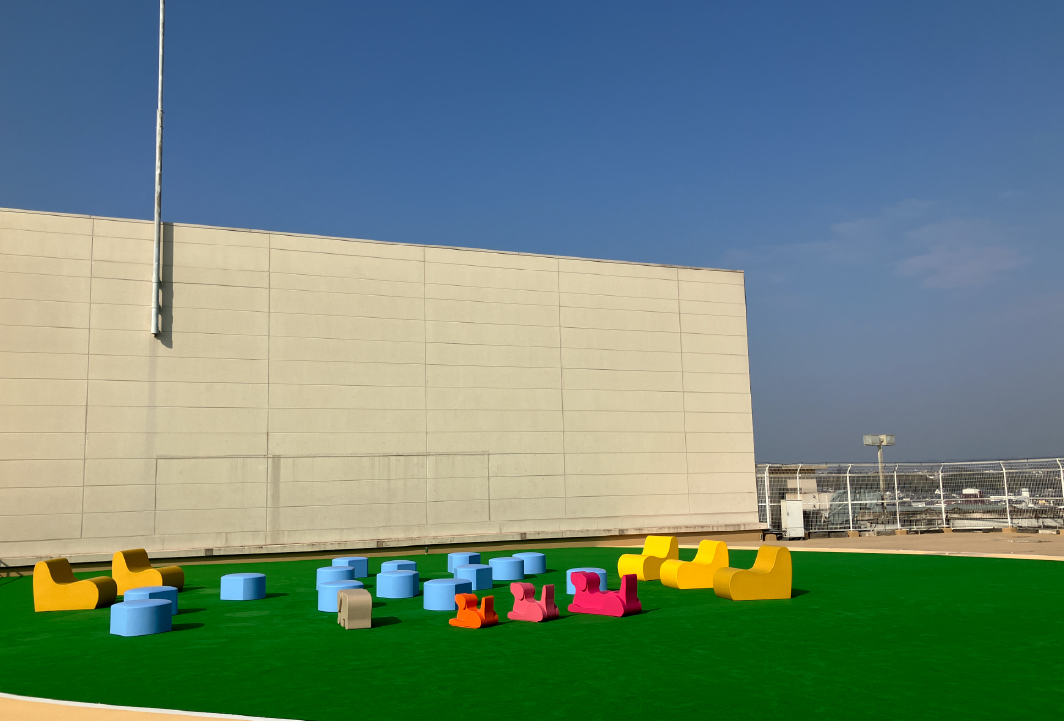 新しい屋上には、子どもたちが遊べるファニチャーが登場しました。かわいい動物モチーフでベンチとしての利用はもちろん、遊具を兼ね、遊び心も満点!温かみのあるカラーリングは落ち着きもあり、広場のアクセントになっています。